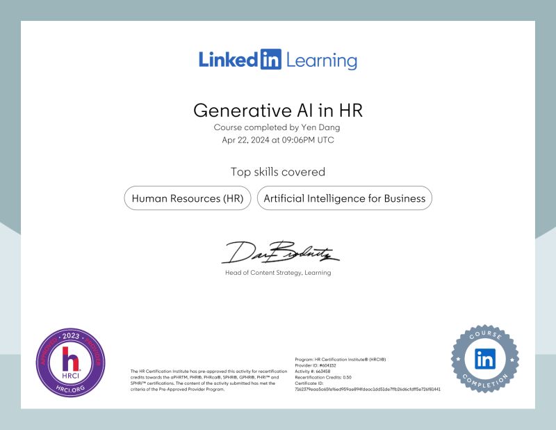 Chứng chỉ từ LinkedIn Learning được công nhận rộng rãi bởi các nhà tuyển dụng trên toàn thế giới. Nó không chỉ là minh chứng cho kiến thức và kỹ năng của bạn, mà còn thể hiện sự cam kết của bạn đối với việc học tập và phát triển bản thân.